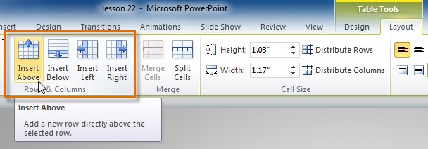 Click the row or column in the table where you want to insert a row or column. Then on the Layout tab, under Table Tools:
